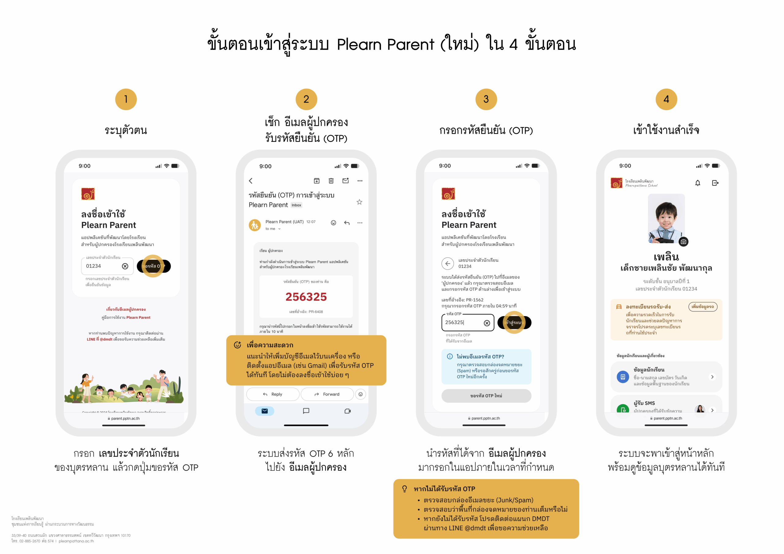 - ตรวจสอบอีเมลผู้ปกครอง (เช่น [email protected]) เพื่อรับรหัสยืนยัน (OTP)